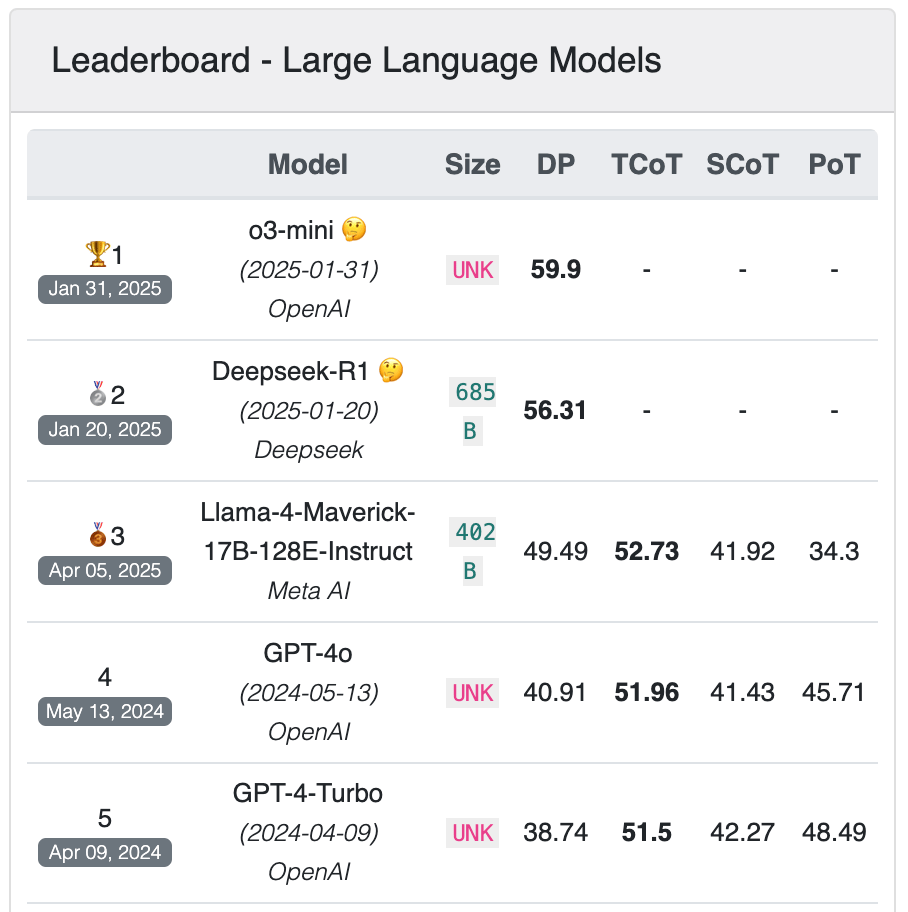 OpenAI models (o-series) still lead, with DeepSeek close behind.