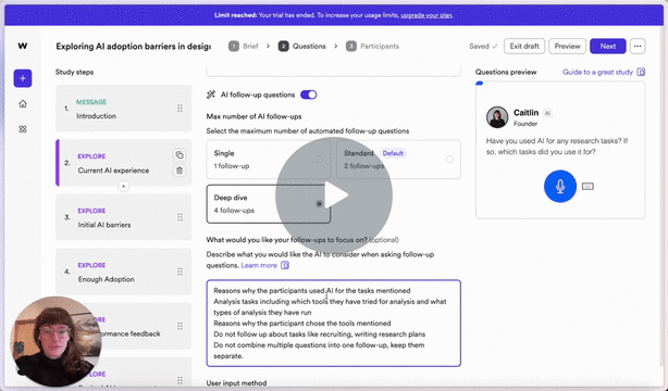 Consider choosing AI moderators that enable you to give some instructions for follow-up questions, and/or don’t have a cap on how much detail you can add in the initial Objectives or Research Questions in the study setup. Across the board, we see that AI needs more context and guidance to determine what we believe is useful and not.