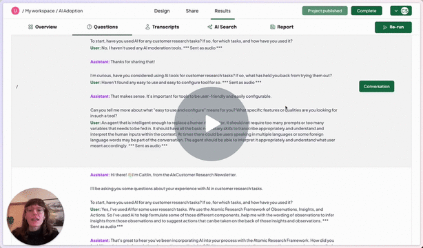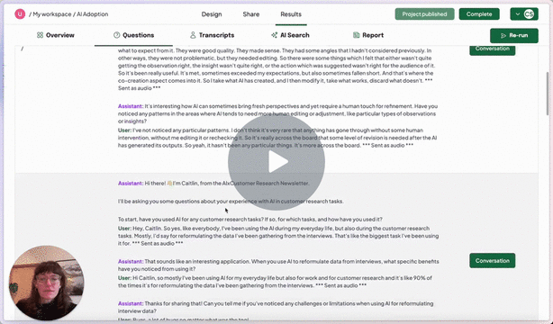 I found that these tools can actually surface useful feedback. In my AI adoption study, many participants provided thoughtful responses - as voice recordings - that helped me pinpoint the exact “why” behind their struggles or needs. I got far richer context than you’d get from a simple survey. I was genuinely surprised by responses much of the time. I also gathered more detail about use cases and contexts where they’re using AI than I have seen in survey responses (but with far less setup time here).