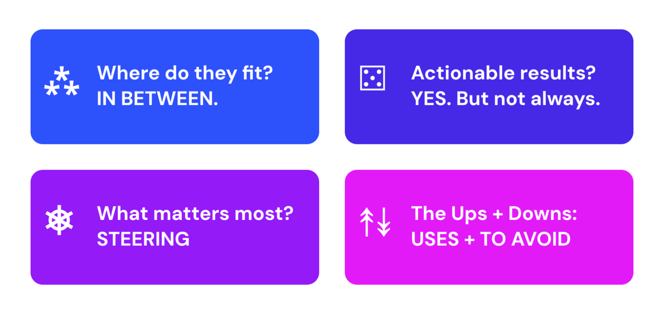 They combine elements of surveys and interviews to try to deliver richer insights from a larger number of participants, often in shorter timeframes.