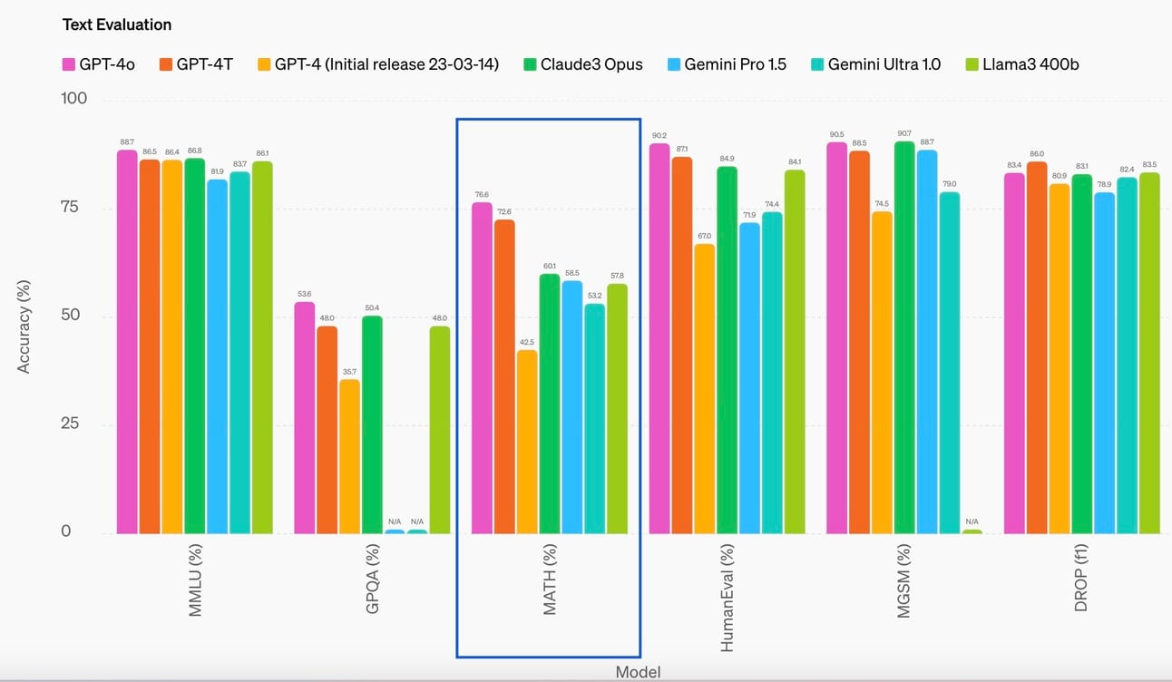For reference, math-related benchmarks suggest how reliably AI models can handle quantitative tasks. So far, GPT-4o has performed best in math evaluations, though it's still only at 76.6% accuracy 👇 When performing data analysis tasks specifically, accuracy levels are seemingly higher, according to this study.