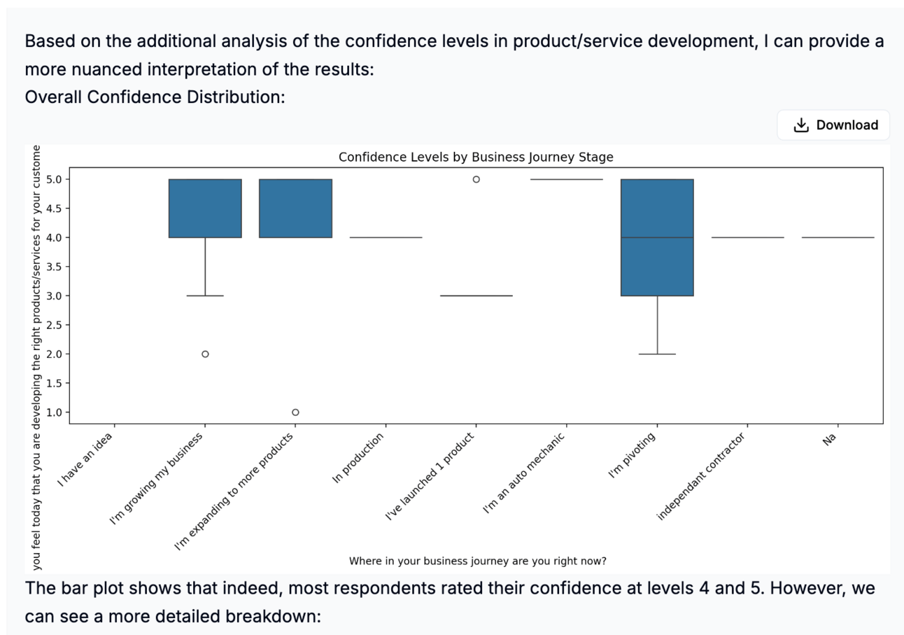 AI is great for quick analysis and visualizations but often misses subtle insights. For example, it might take survey responses at face value and present calculations as fact, without considering if participants are misrepresenting themselves, like showing overconfidence. While this isn’t always crucial for useful insights, it’s worth considering depending on your data and goals.Example: In one of my surveys, participants seemed to overestimate their knowledge of product development, with many rating their confidence a 5 on a 1-5 scale, saying that they were certain they were developing a product customers would value. At first glance, it seemed they had no issue knowing what to build for customers. However, AI didn’t mention possible respondent bias or overconfidence in its analysis.