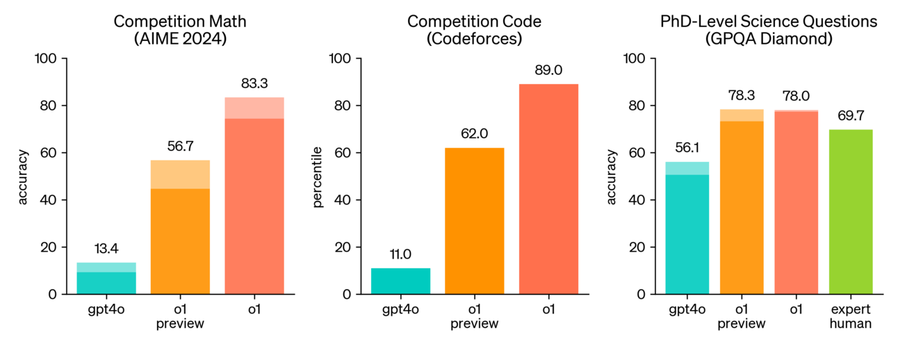 The “o1” model outperformed PhD-level experts in chemistry, physics, and biology on the challenging GPQA-diamond intelligence benchmark, becoming the first model to achieve this.