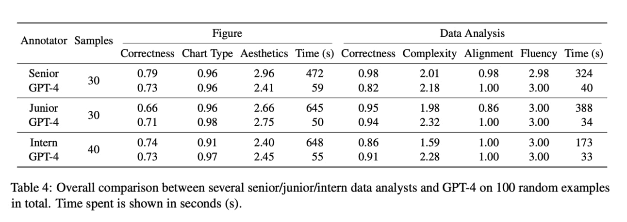 In tasks like creating visualizations and extracting data (see “Chart Type” and “Aesthetics” in the table above), GPT-4 performed almost as well as entry-level analysts.Human analysts still outperform GPT-4 on nuanced insights.