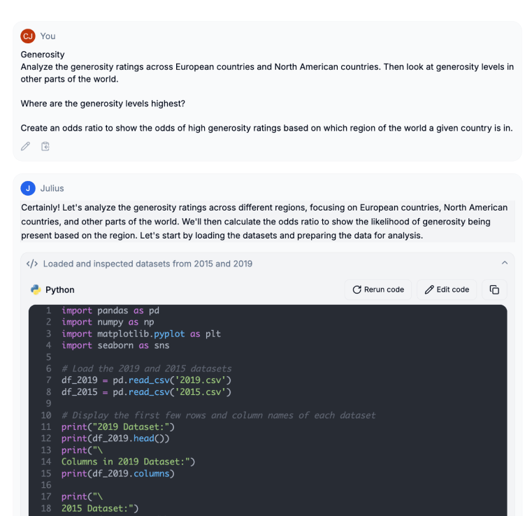 Many of us struggle to understand how AI reaches analysis conclusions. I found Julius to be more transparent than ChatGPT for showing it’s “thinking” process. It explains its process step-by-step, including showing the Python libraries and code used, allowing users to review and edit steps to improve accuracy and relevance as an analysis runs. It runs on the major models (ChatGPT, Claude, Gemini, Cohere), but offers its way of interfacing with the process.